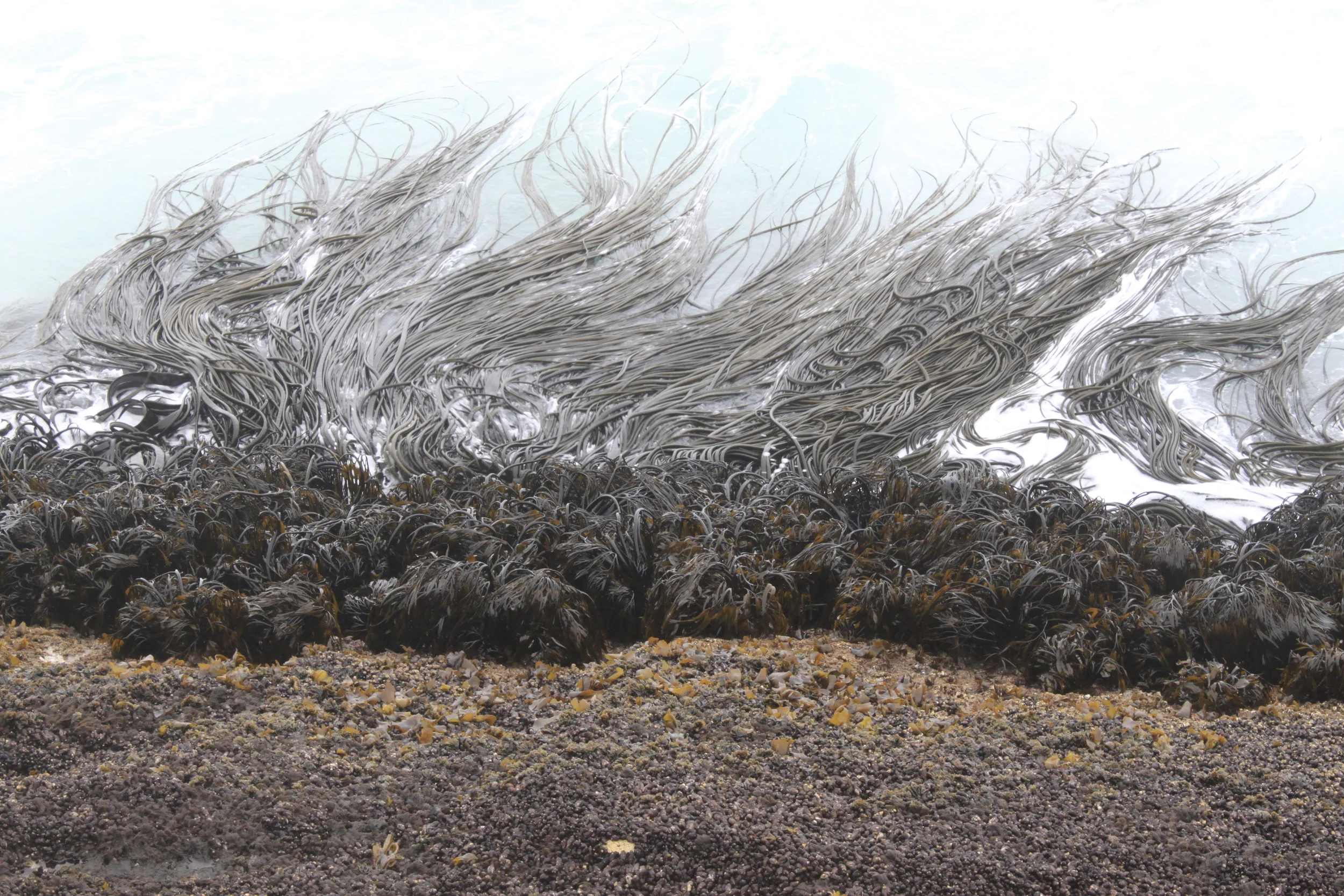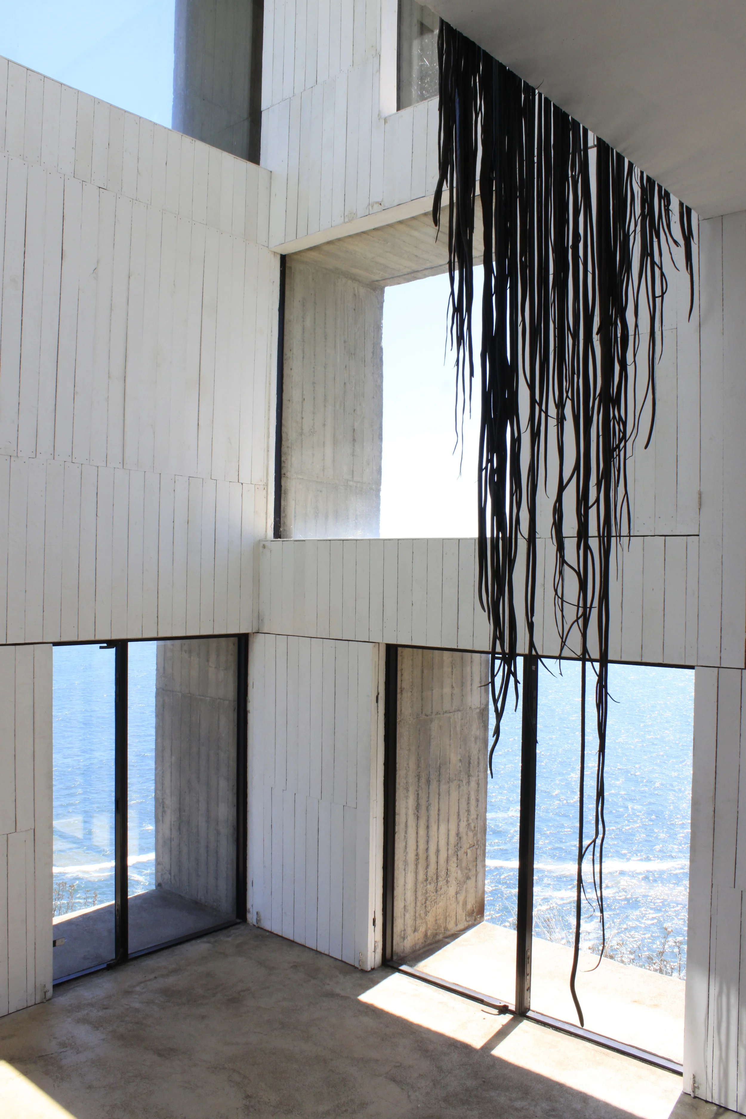 The installation included a 3-channel video with three, dual-projection screens, molded kelp, steel, bronze, inkjet prints, glass and railroad ties. An artist residency at Casa Poli, Coliumo, Chile, resulted in my exploration of cochayuyo, giant kelp whose tendrils commonly reach 24 feet in length. Sculpture, video, and large-scale digital prints work together to depict the struggle between the human drive to create lasting symbols of culture, and Nature’s indifferent, persistent erasure of these symbols. The final image is of the cochayuyo suspended inside the walls of Casa Poli.